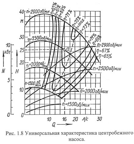 Образец универсальной характеристики одного из центробежных насосов приведен на рис. 1.8.