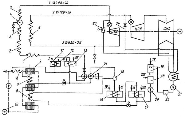 7 – теплообменик на байпасе ПВД; 8 – охладитель воздуха; 9 – воздухоподогреватель; 10 – дутьевой вентилятор; 11–13 – ПВД №7–9; 14 – турбопитательный насос; 15 – смеситель; 16 – ПНД №5 и №6; 17 – ПНД №3 и №4; 18–19 – смешивающие ПНД №1 и №2; 20, 21 – конденсатные насосы; 22 – блочная обессоливающая установка; 23 – БРОУ;