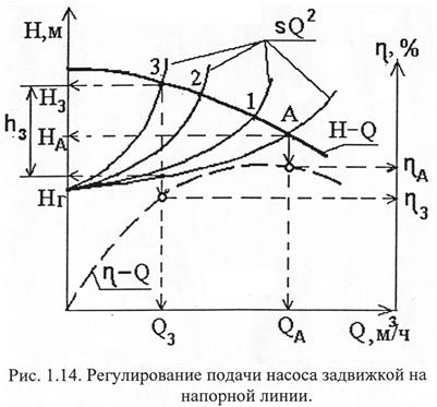 Изменяя степень закрытия задвижки получают новую характеристику трубопроводов и новое положение рабочей точки (рис. 1.14).