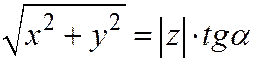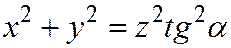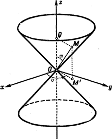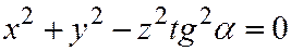 Пример 3. Составим уравнение прямой круговой конической поверхности К, вершина которой находится в начале декартовой прямо-угольной системы координат, а острый угол между образующими поверхности и осью Оz равен