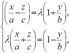 уравнение (9) гиперболоида получается перемножением системы (10) и сокращением на