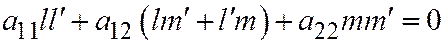 можно теперь интерпретировать как необходимое и достаточное условие сопряженности двух диаметров линии второго порядка, имеющей единственный центр и заданной общим уравнением (1) относительно ОДСК. Если
