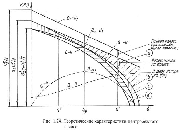 На рис. 1.24 изображена теоретическая характеристика Qт – Нт , наклон которой зависит от угла