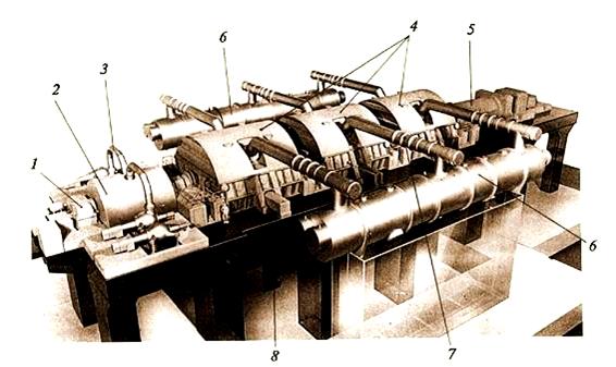 7. По числу валопроводов различают турбины одновальные (имеющие один валопровод – соединенные муфтами роторы отдельных цилиндров и генератора) и двухвальные (имеющие два валопровода каждый со своим генератором и связанные только потоком пара).