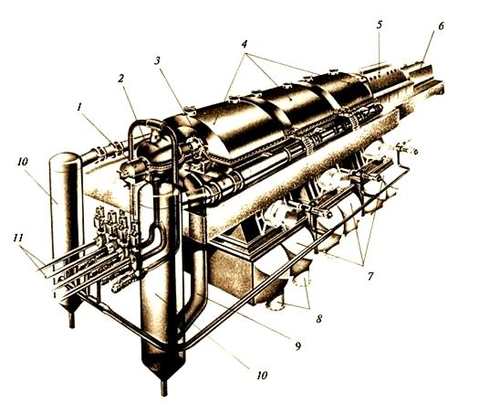 Для АЭС, построенных для теплых климатических условий, т.е. для высокой температуры охлаждающей воды и соответственно высокого давления в конденсаторе, можно строить и быстроходные атомные турбины (рис. 4.9.16). Пар к ЦВД турбины поступает из реакторного отделения по четырем паропроводам 11. Пройдя ЦВД, пар поступает к СПП 10 вертикального типа, а после них с помощью ресивера 3 раздается на три одинаковых двухпоточных ЦНД 4. Под каждым ЦНД установлен свой конденсатор, также хорошо видный на макете.