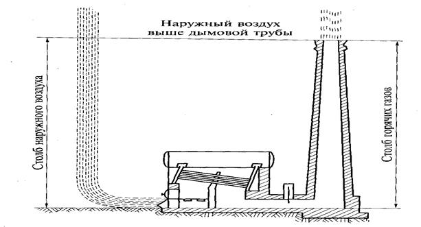 Естественная тяга возникает из-за разности давлений вследствие различия плотностей наружного холодного воздуха и горячих дымовых газов в трубе, в результате которой возникает движение потока дымовых газов по газоходам котла.