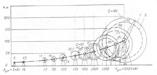 Из рисунка 8.9.6 видно, как установленная мощность Руст, развиваемая ветроколесом с горизонтальной осью вращения, зависит от его размеров.