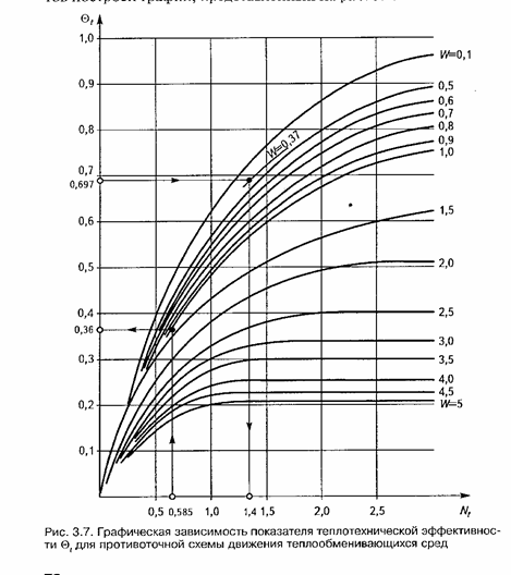 4. Выше вычислено, что для принятого режима нагрева воды в пластинчатом теплообменнике показатель теплотехнической эффективности ( по формуле 2. 1) должен быть равен Өw.г. = 0,8. По графику на рис. 3.7 при принятых величинах Өw.г. = 0,8 и Ww.теп = 0,8 находим, что требуется достижение показателя числа единиц переноса Nt = 2,8.