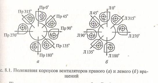 Радиальные вентиляторы имеют раздичные положения корпуса (рис. 8.1) в зависимости от направления вращения (Пр и Л) и угла поворота выходного патрубка.