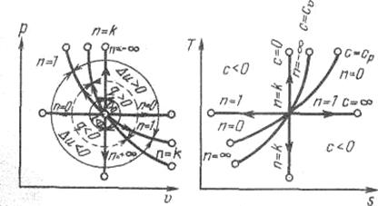 подбирая соответствующее значение п. Процесс, описываемый данным уравнением называется политропным (всякий процесс идеального газа, в котором удельная теплоемкость является постоянной величиной, называется политропным). Показатель политропы п может принимать любое численное значение в пределах от – ¥ до + ¥, но для данного процесса он является величиной постоянной.