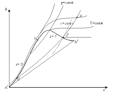 для сухого насыщенного пара, получаем нижнюю и верхнюю пограничную кривые. Критическая точка К лежит не на вершине, а на левом склоне пограничной кривой. В области влажного пара температура вдоль изобары не изменяется, и она представляет собой наклонную прямую линию. После пересечения верхней пограничной кривой, температура вдоль изобары возрастает, и ее угловой коэффициент постепенно увеличивается. Чем больше давление, тем выше расположена изобара и тем круче она идет. Изотермы отделяются от изобар на верхней пограничной кривой. В области перегретого пара они обращены выпуклостью вверх. По мере роста температуры и уменьшения давления их кривизна уменьшается. Вдали от состояния насыщения изотермы приближаются к горизонталям