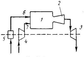 На рис. 1.31 дана схема простейшей газотурбинной установки со сгоранием топлива при постоянном давлении. Топливным насосом 5 и компрессором 4 топливо и воздух через форсунки 6 и 7 поступают в камеру сгорания 1. Из камеры продукты сгорания направляются в комбинированные сопла 2, где они расширяются, и поступают на лопатки газовой турбины 3.