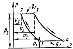 1-2 - адиабатное сжатие до давления р2; 2-3 – подвод теплоты q1 при постоянном давлении р2 (сгорание топлива); 3-4 – адиабатное расширение до первоначального давления р1; 4-1 – охлаждение рабочего тела при постоянном давлении р1 (отвод теплоты q2)