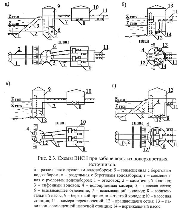 Водопроводные насосные станции I подъема забирают воду из источника и осуществляют подачу по одной из трех основных схем: