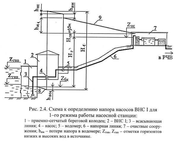 Схема к определению напора насосов ВНС I для 1-го режима работы насосной станции приведена на рис. 2.4.