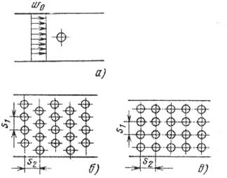 а – одиночной трубы; б – шахматный пучок; в – коридорный пучок.