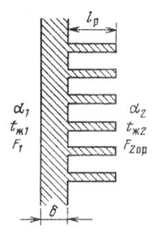 Термическое сопротивление теплоотдачи Rα2 за счет оребрения поверхности уменьшается пропорционально коэффициенту оребрения (отношению площади оребренной поверхности к площади гладкой поверхности до ее оребрения), т.е. Kор=Fор/Fгл.
