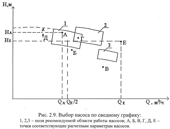 подбираются насосы для проектируемой насосной станции. Выбор марки насосов производится по сводному графику характеристик центробежных насосов, а затем уточняется по рабочим характеристикам насосов. При подборе насосов следует иметь в виду, что основным расчетным режимом является 1-й режим с параметрами