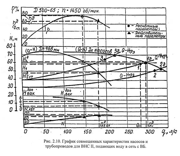 Координаты точек пересечения кривых (см. рис 2.10 и 2.11 на графиках точки 1 ∂, 1 ∂′, 2 ∂, 3 ∂) являются рабочими точками насосов, которые показывают действительную производительность и напор, создаваемые данными насосами при соответствующем режиме работы насосной станции. Координаты точек 1, 1′, 2, 3 показывают производительность и напор, установленные расчетами.