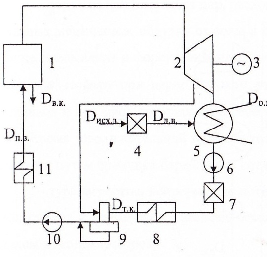 1 - паровой котел; 2 - паровая турбина; 3 - электрогенератор; 4 - водоподготовительная установка; 5 - конденсатор; 6 - конденсатный насос; 7 - конденсатоочистка (БОУ); 8 - ПНД; 9 - деаэратор; 10 - питательный насос; 11 – ПВД.