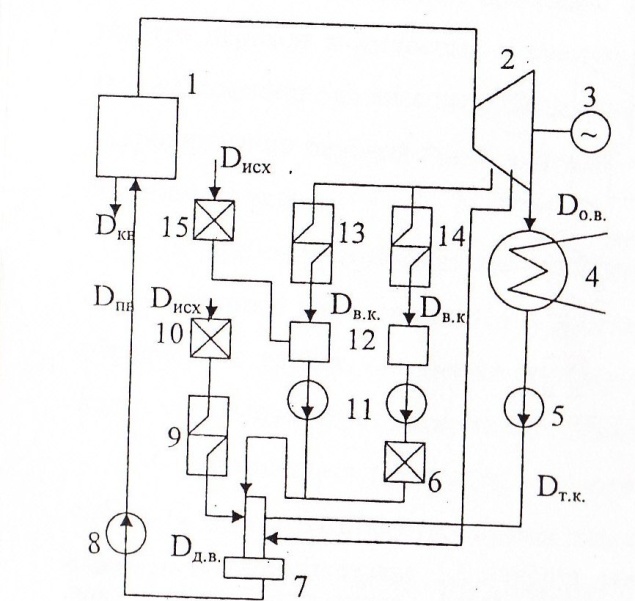 1 — паровой котел; 2 — паровая турбина; 3 - электрогенератор; 4 — конденсатор; 5 - конденсатный насос; 6 - установка очистки возвратного конденсата; 7 - деаэратор; 8 - питательный насос; 9 - подогреватель добавочной воды; 10 - водоподготовка подпитки котлов; 11 - насосы обратного конденсата; 12 - баки возвратного конденсата; 13 - производственный потребитель пара; 14 - промышленный потребитель пара; 15 - водоподготовка подпитки теплосети.
