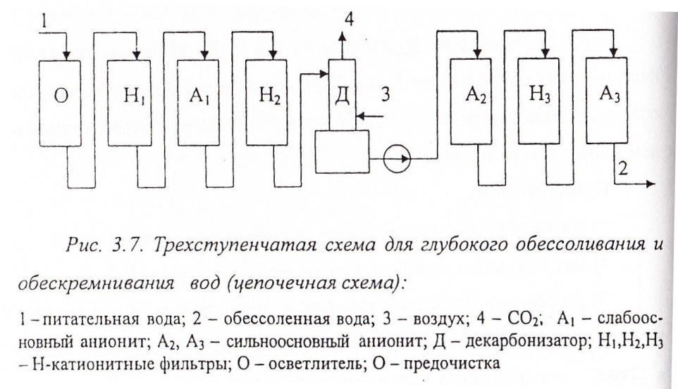 Трехступенчатая схема для глубокого обессоливания и обескремнивания вод (цепочная схема)