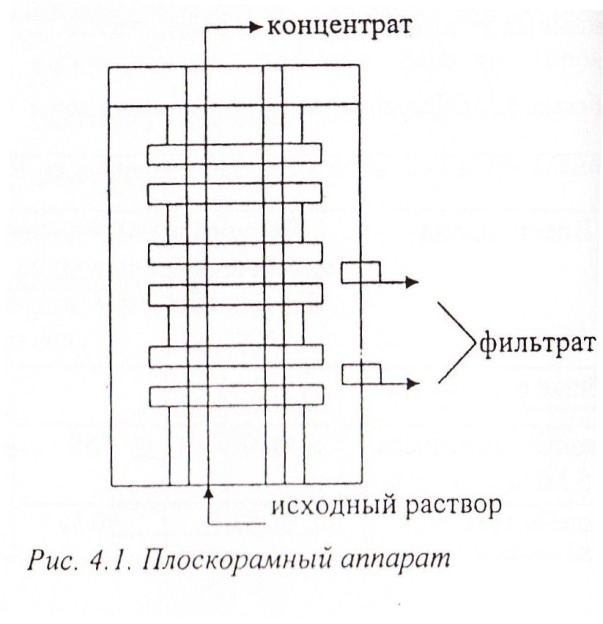 Мембраны вместе с дренажными устройствами набираются в пакеты, которые сжимаются между опорными пластинами. Исходная вода последовательно протекает вдоль поверхностей мембран, частично фильтруется через них и в виде рассола покидает аппарат. Фильтрат выводится со стороны низкого давления с каждой мембраной.