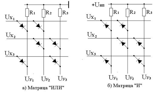 На рис. 3.29 приведен пример двух матриц – «И» и «ИЛИ». Каждая вертикальная линия в этих матрицах – это один диодный логический элемент «И» или «ИЛИ». На входы матриц подаются напряжения UxI, соответствующие логическим переменным xI. Значению xI=0 в матрице соответствует UxI=0 [В], значению xI = 1 соответствует UxI=Uип [В], где Uип – напряжение источника питания в вольтах. Выходные напряжения матриц UуI соответствуют значениям функций уI , реализуемых данными матрицами. Причем нетрудно заметить, что в матрице «ИЛИ» UуI=Uип (уI =1), если в узле матрицы на пресечении линий UуI и UxJ есть диод и UxJ=Uип (xJ=1). В матрице «И» UуI=Uип (уI =1), если на всех входах, соединенных диодами с шиной UуI, значения UxJ=Uип (xJ=1) и UуI=0 В (уI =0), если хотя бы на одном из входов UxJ= 0 В (xJ=0).