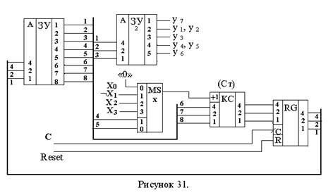 Отличие этой схемы от рис.28 состоит в использовании вместо мультиплексора адреса MSа комбинационного счетчика (Ст). Комбинационная схема (КС), обозначенная как Ст, выполняет функцию: Ст:=А + Xi, где:
