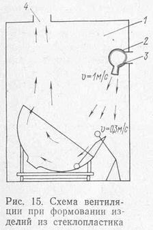 Для создания благоприятных условий в рабочей зоне необходимо не только подать в помещение потребное (расчетное) количество воздуха, но важно и правильно организовать воздухообмен. Например, при формовании изделий из стеклопластика вентиляция рабочего места может быть организована так, как показано на рис. 15.