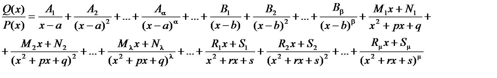 - правильная рациональная дробь, знаменатель P(x) которой представлен в виде произведения линейных и квадратичных множителей (отметим, что любой многочлен с действительными коэффициентами может быть представлен в таком виде: P(x) = (x - a)a…(x - b)b(x2 + px + q)l…(x2 + rx + s)m ), то эта дробь может быть разложена на элементарные по следующей схеме: