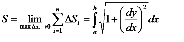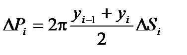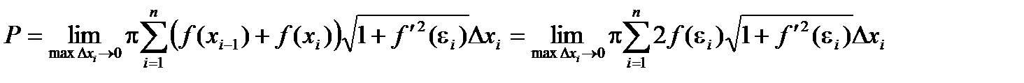 Разобьем дугу АВ на n частей точками M0, M1, M2, … , Mn. Координаты вершин полученной ломаной имеют координаты xi и yi. При вращении ломаной вокруг оси получим поверхность, состоящую из боковых поверхностей усеченных конусов, площадь которых равна DPi. Эта площадь может быть найдена по формуле:
