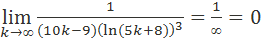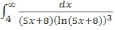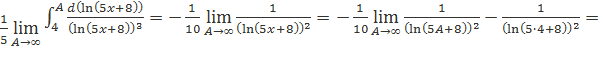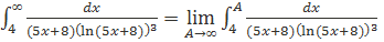 (проверить эти факты самостоятельно) то можно воспользоваться интегральным признаком Коши выполнив под интегралом замену переменных типа ln(5x=8)=t или подвести под знак дифференциала выражение (5х+8), которая там представится, как ln(5x+8):
