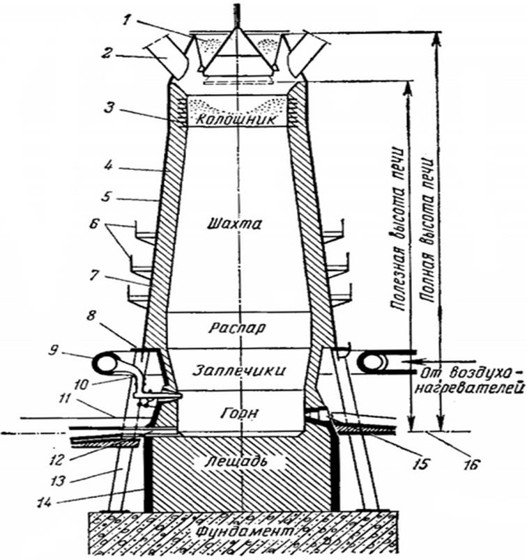 1 — засыпной аппарат; 2 — газоотводы; 3 — защитные плиты; 4 — огнеупорная кладка; 5 —стальной кожух; 6 — кольцевые площадки; 7 — холодильники шахты; 8 — опорное кольцо; 9 — кольцевой воздухопровод; 10 — фурменный рукав; 11 — рабочая площадка; 12 — колонна; 13 — летка для чугуна; 14 — холодильники; 15 — летка для шлака; 16 — ось чугунной летки.