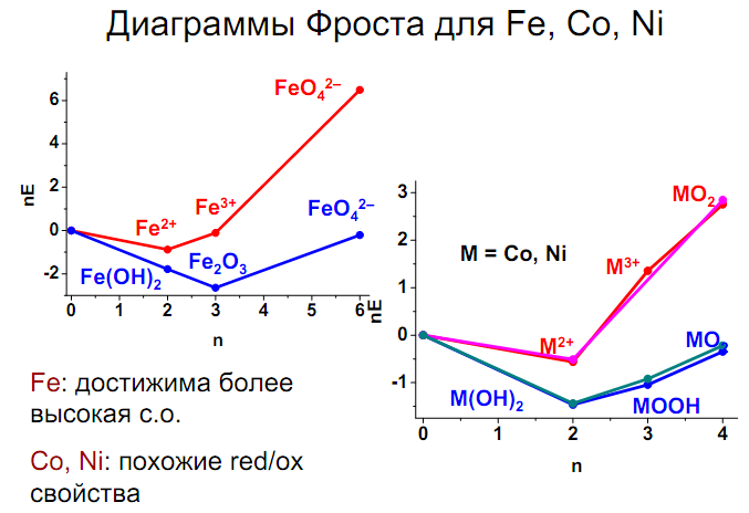 2. Триада железа (Fe, Co, Ni). Диаграммы окислительно-восстановительных свойств. Пирофорные свойства. Ферромагнетизм. Отношение металлов к воде, кислороду, растворам кислот и щелочей. Соединения Э2+: оксиды, гидроксиды, соли, комплексы.