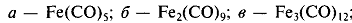 Соединения элементов в низких степенях окисления представлены карбонилами. При взаимодействии тонко измельченного железа с CO при повышенных значениях температуры и давления образуется желтая жидкость состава Fe(CO)5, состоящая из тригонально-бипирамидальных молекул. При облучении ультрафиолетом жидкость превращается в золотисто-желтые кристаллы биядерного карбонила Fe2(CO)9 со связью металл—металл, который при нагревании до 100 °С распадается на Fe(CO)5 и треугольный карбонильный кластер Fe3(CO)12. Карбонилы: