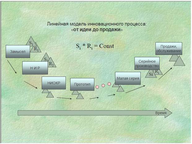 Для иллюстрации стадийности часто используют так называемую «линейную модель инновационного процесса», основанного на продвижении технологии. Для обоих режимов продвижения – «рыночной тяги» и «технологического толчка» модель имеет одинаковый вид. Однако, как мы увидим далее, смысл таких этапов продвижения как «замысел», «прототипирование» и «малое серийное производство» для разных режимов оказывается различным.