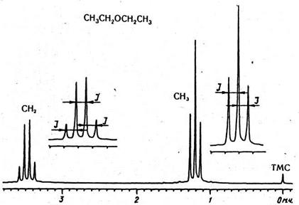 Рис. 1.22. Спектр діетилового ефіру на ядрах 1Н. Вигляд мультиплетів показано у збільшеному вигляді. Відстань між компонентами мультиплетів дорівнює константі спін-спінової взаємодії J.
