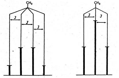 Сигнали, що відповідають усім магнітно-нееквівалентним протонам сполуки, розщеплюються на мультиплети—триплет (СН3) і квартет (СН2). Надтонка структура сигналів зумовлена явищем, яке відоме під назвою спін-спінової взаємодії (coupling). Відстань між двома сусідніми компонентами у кожному з мультиплетів, виражена в герцах, називається константою спін-спінової взаємодії (КССВ, coupling constant, J). На відміну від хімічного зсуву, КССВ не залежить від робочої частоти приладу, тому відстань між компонентами мультиплетів є однаковою, незалежно від приладу, на якому виміряний спектр. У наведеному прикладі наявне розщеплення можна зобразити схемою, що наведена на рис. 1.23.