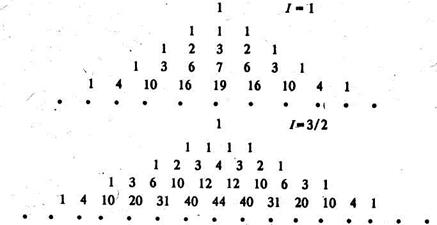 Для тих випадків, коли спіни ядер більші за 1/2, можна побудувати числові трикутники, подібні до трикутника Паскаля. Нижче наведені два такі трикутники для випадків I=1 та I=3/2. Тут, щоб дістати числа будь-якого нижнього ряду, додають вже не два, а три і відповідно чотири числа, що містяться у попередньому верхньому ряду (включаючи нулі справа і зліва від одиниць):
