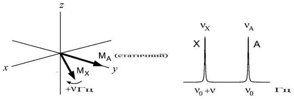 Після збудження одиничним 90о імпульсом обидва вектори розташуються в площині х-у вздовж осі у. Якщо вибрати опорну частоту імпульсу такою, що дорівнює резонансній частоті ядра А, (no = nA), то вектор намагніченості цього ядра, як і раніше, буде мати стаціонарне положення в СКО (якщо ігнорувати явища релаксації). Якщо ядро Х має хімічний зсув, більший ніж А, тобто nA < nX, то вектор ядра Х буде обертатися швидше, ніж вектор А і СКО на n Гц, тому він буде обганяти вектор А (Рис. 1.30). Якщо ж, навпаки, nA > nX, він буде рухатися більш повільно та відстане від вектора А. Набір із трьох спінів за відсутності спін-сінової взаємодії можна описати трьома векторами і т.д. Таким чином, розбіжності в хімічних зсувах між спінами можна представити у вигляді векторів, що прецесують з різною швидкістю. В СКО їхній рух залежить від різниці між хімічними зсувами ядра та опорною частотою імпульсу no. При цьому слід враховувати, що різниця хімічних зсувів магнітних ядер лежить у діапазоні декількох кілогерців, у той час як абсолютні частоти ядерної прецесії можуть становити багато мегагерців.