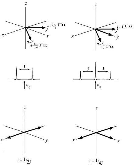 Рис. 1.31.Скалярні розщеплення в системі координат, що обертається. Компоненти мультиплетів еволюціонують відповідно до їхніх констант розщеплення. Після періоду еволюції 1/2J і 1/4J с вектори відповідно для дублетів і триплетів мають протифазне розташування.