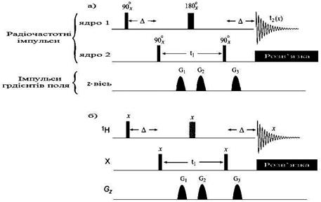 На Рис. 1.32 показано приклад запису порівняно складної імпульсної послідовності (експеримент гетероядерної кореляції) і розшифровано основні її складові, причому на Рис. 1.32а показана більш детальна розшифровка, а на Рис. 1.32б – її скорочений еквівалент, що застосовується найчастіше. Радіочастотні імпульси, які подаються на кожне з ядер, представлені на окремих рядках. Їхнє розташування зліва направо відповідає часу подачі відповідного імпульсу. Вважається, що вісь часу є єдиною для імпульсів на різних ядрах. Тому, якщо імпульси на різні ядра подаються одночасно, то вони розташовані на схемі один під одним. Більшість експериментів, що використовуються сьогодні, включають імпульси на протонах і ще на одному або двох додаткових ядрах. В органічній хімії найчастіше такими ядрами є ядра вуглецю, однак замість нього може бути використане будь-яке ядро, що позначається як Х-ядро. В імпульсних послідовностях найчастіше використовуються 90о і 180о імпульси. Вони позначаються відповідно вузьким чорним та сірим широким прямокутниками. Імпульси з іншими кутами повороту вектора намагніченості позначаються грецькими літерами над відповідними прямокутниками, які описуються в поясненнях. Кожний імпульс характеризується фазою, що вказується над імпульсом.