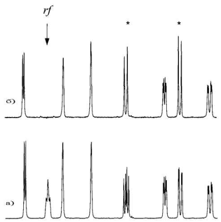 Гомоядерний декаплінг включає селективний вплив когерентного радіочастотного поля на один з сигналів з метою виявлення партнерів по ССВ. Найчастіше він використовується в протонній спектроскопії (Рис. 1.48). Хоча використання даного методу для ідентифікації 1Н-1Н взаємодії в значній мірі витіснене двомірними кореляційними методами, він продовжує залишатися зручним і корисним інструментом у ЯМР-досліженнях. Метод легко реалізувати і він дає швидкий результат при вирішенні відносно простих задач. Особливо він корисний для ідентифікації спінів з дуже малими КССВ, які важко виявляти в експериментах по 2D кореляції. У дуже перевантажених спектрах, де можуть бути виявлені тільки окремі взаємодії, результат експериментів по подвійному резонансу може бути виявлений методом різницевої спектроскопії. У цьому випадку спектр, що виміряний без декаплінгу, віднімають від спектра з ввімкненим декаплером. Це дозволяє точніше виявити зміни в спектрі. Однак для аналізу таких спектрів більше підходять двомірні методики.