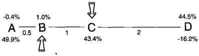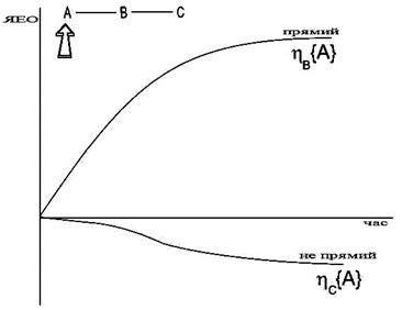 Рис. 1.59.Стаціонарні трьохспінові ефекти. Негативний ЯЕО для C виникає через непрямий ефект, що передається через спін B при насиченні спіна А. У величину ЯЕО для В вносить свій внесок зміна населеностей спіна С (див. Рис. 8.12)