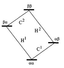 Рис 1.65. Діаграма енергетичних рівнів для двохспінової 'H-13C системи. Два переходи для кожного ядра відповідають двом лініям у кожному дублеті.