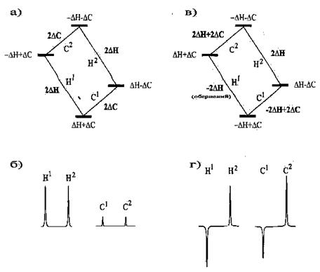 У тепловій рівновазі населеності кожного із чотирьох переходів визначаються розподілом Больцмана. Схематично це показано на Рис.1.66а. Нехай різниця населеностей для протонних і вуглецевих переходах становлять відповідно 2DH і 2DC. Оскільки населеності лінійно залежать від g, 2DH / 2DC = gH/gX =4. Тому інтенсивність сигналу протонів повинна бути в 4 рази більшою, ніж сигналу вуглецю (Рис. 1.66б). Тепер подивимося, що відбудеться, якщо селективно інвертувати один з компонентів дублету 1Н, наприклад Н1. Зробити це можна за допомогою слабкого селективного 180о імпульсу. При цьому для відповідного переходу відбудеться інверсія населеностей рівнів (Рис. 1.66в). Оскільки перехід Н2 залишився незбудженим, то й різниця населеностей у цьому переході буде такою самою, що і до експерименту. Ключовим моментом є те, що в результаті інверсії змінилися населеності обох вуглецевих переходів. Так для С1 різниця населеності становитиме -2DH+2DC, а для переходу С2 -2DH+2DC. Таким чином, різниця населеностей, що спочатку спостерігалася для протонів, тепер перенесена на вуглець. Оскільки 2DH є в 4 рази більшою, ніж 2DC, то для С-переходів відносні інтенсивності становитимуть –3:5. Таким чином, якщо після такої початкової інверсії компонента протонного спектра подати неселективний імпульс на частоті атомів вуглецю, то отримаємо спектр, в якому міститься дублет, одна з компонентів якого є інвертованою, причому інтенсивність компонентів буде більшою, ніж в одноімпульсному експерименті на вуглеці (Рис. 1.66г). Для пари 1Н-15N інтенсивності компонентів сигналу 15N при перенесенні поляризації від протонів становлять +11 і –9 (gH/gN = 10) і зростання інтенсивності сигналу буде ще більшим. Хоча половина населеності спіна Н інвертована, однак інтенсивності компонентів протонного сигналу залишились незмінними. Тому сумарного перенесення намагніченості від протонів до вуглецю не відбувається. Інтегральна інтенсивність усього дублета вуглецю також не відрізняється від тієї, котра мала місце до збудження. Тому можна говорити про диференціальне перенесення поляризації, коли змінюються лише інтенсивності компонентів мультиплетів.