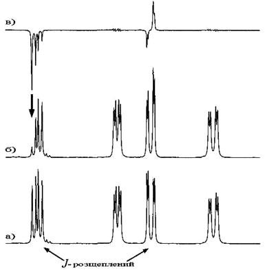 Рис.1.67. Селективне перенесення населеності (SPT) спотворює інтенсивність протонного мультиплету, якщо сигнал спіново-зв’язаного партнера насичується нерівномірно (б). Зміни інтенсивності краще видні в різницевому спектрі (в), що отриманий шляхом віднімання від (б) незбуреного спектра (а).