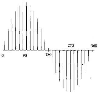 Рис. 2.29.Калібрування тривалості імпульсу в каналі спостереження. В експерименті застосовувалася імпульсна послідовність із збуджуючим імпульсом, якому задавалися постійні прирости. Максимальний сигнал спостерігається для випадку, коли імпульс виявляється 90°. Перше нульове значення сигналу відповідає 180° імпульсу. Для калібрування можна скористатися як 180° так і 360° імпульсом.