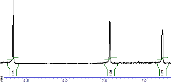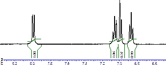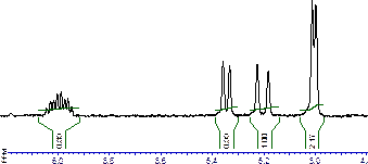 | В спектрі легко розрізняються сигнали протонів, що мають цис- та транс- партнера по ССВ (3J = 7 та 15 Гц відповідно) | |